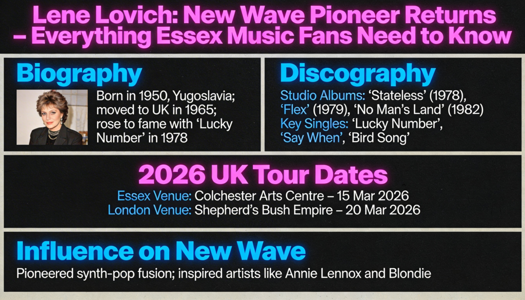 According to concert listings and ticketing platforms, Lene Lovich is returning to British stages in 2026, with confirmed dates including The O2 in London and the AO Arena in Manchester. For residents of Essex, this represents a splendid opportunity to witness one of the most singular figures in British music history virtually on their doorstep — travelling to the O2 from most towns in the county is straightforward.