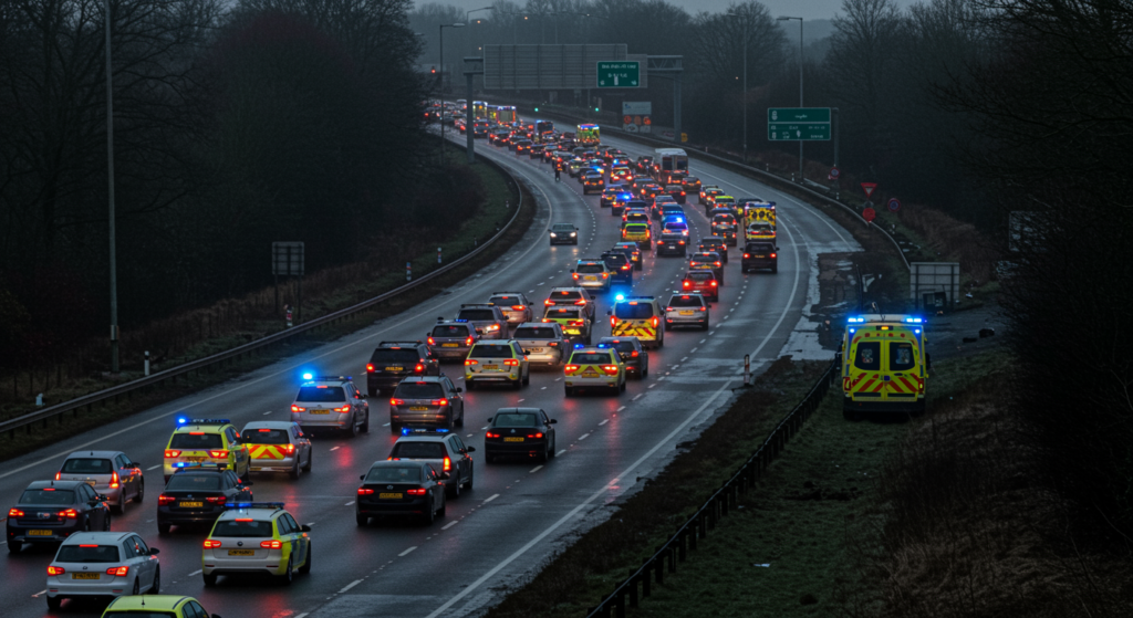 A serious road traffic collision involving four vehicles brought the M11 southbound to a standstill near Stansted Airport on Saturday 7 December 2025. The incident occurred shortly after 3:30 pm between Junction 8 (Bishop’s Stortford) and Junction 7A (Harlow), forcing the closure of all lanes for more than four hours.