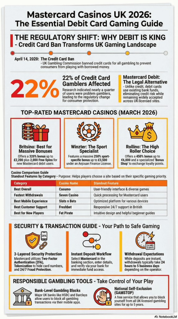 Important: Credit cards, including Mastercard credit cards, have been banned for online gambling in the UK since 14 April 2020. This regulation, introduced by the UK Gambling Commission, protects consumers from gambling with borrowed money. However, Mastercard debit cards remain a widely accepted, secure payment method at UK-licensed online casinos.