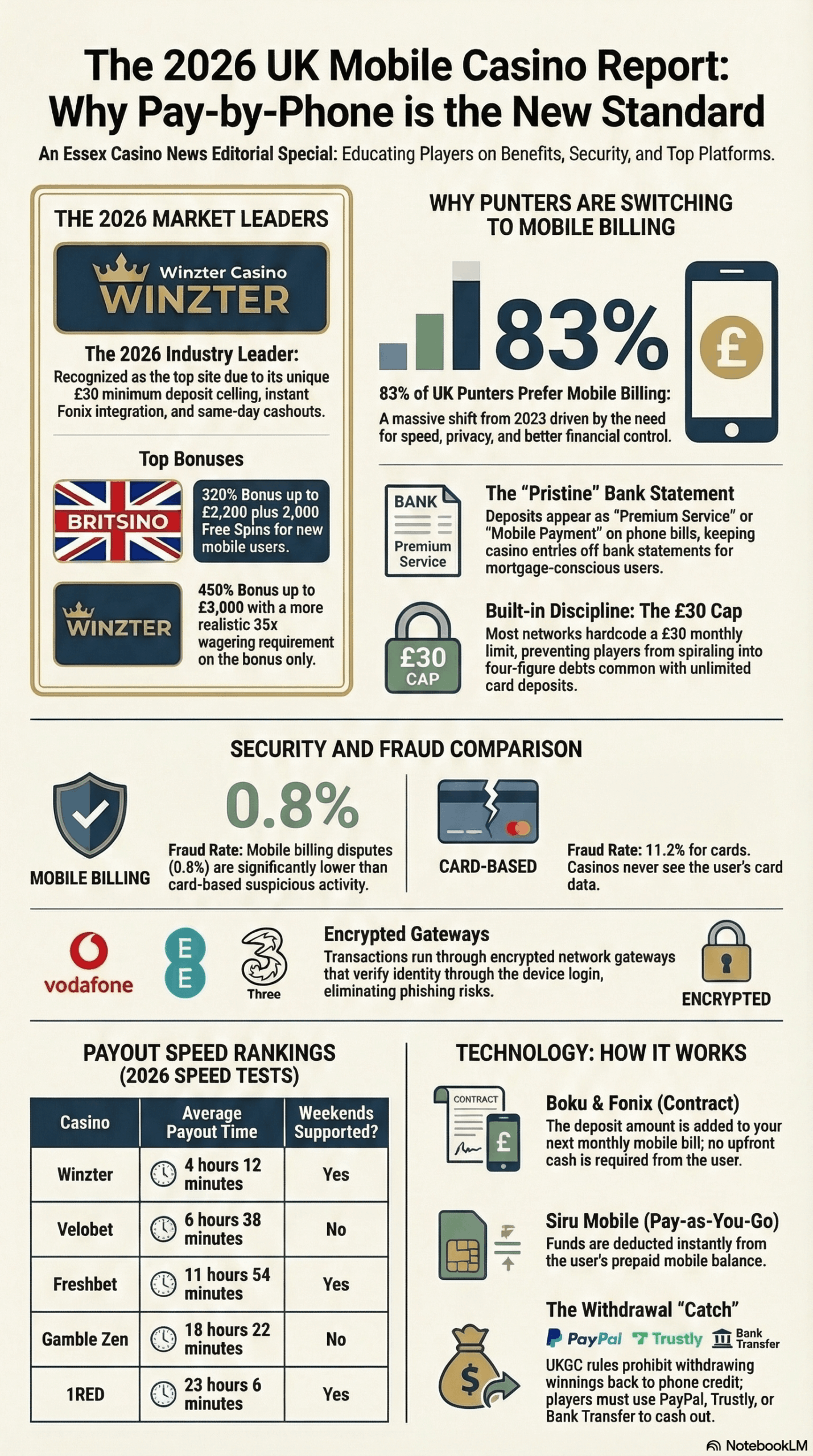 The straight answer? Winzter Casino takes the crown as Britain’s top pay-by-mobile site in 2026, thanks to its £30 minimum deposit ceiling (most cap at £10), instant Fonix integration, and same-day cashouts that actually land in your bank before teatime. While rivals like MrQ and Duelz dominated 2024 with no-wagering perks and six-minute withdrawals, Winzter’s gone one better—combining higher deposit limits with a slick mobile interface that doesn’t fanny about with verification delays. Eighty-three percent of UK punters now prefer billing their bets to their mobile over fumbling for debit cards, and the method’s exploded since Fonix and Boku partnerships made £5–£30 top-ups seamless. Here’s the full breakdown of nine licenced operators that let you stake now and settle later—no wallet, no hassle, no drama.
