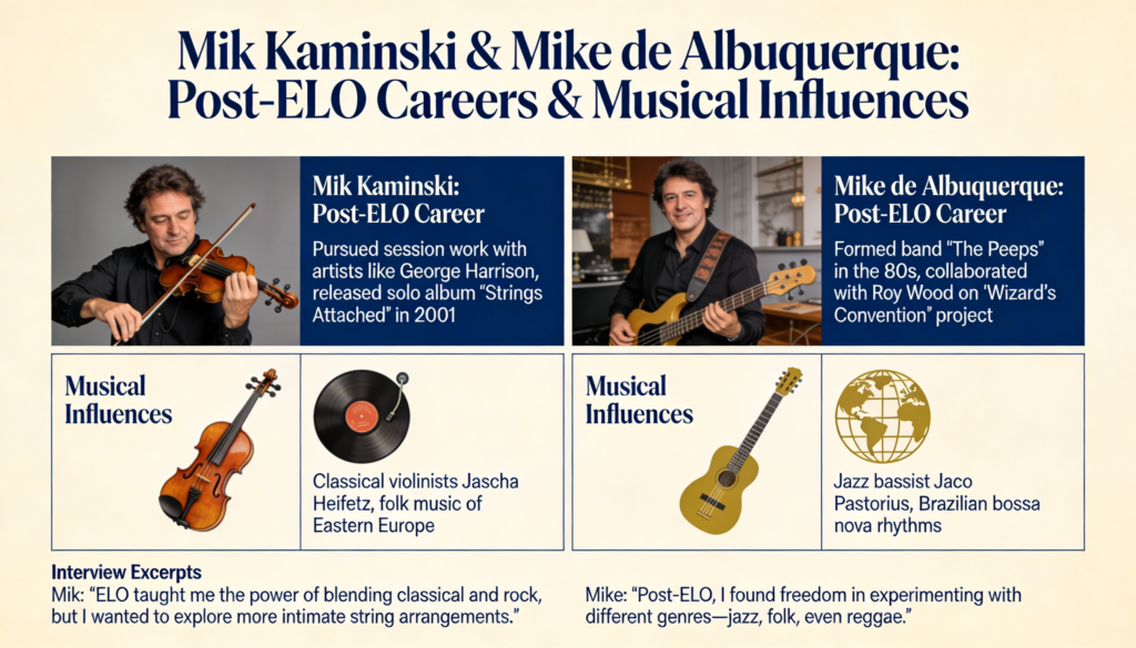 Their paths temporarily diverged. In 1973, Kaminski answered an advert in Melody Maker for the vacant violinist post in ELO. He auditioned before bandleader Jeff Lynne and was recruited — reportedly the only candidate who didn’t play a single bum note. With ELO, Kaminski recorded several iconic albums, including On the Third Day, Face the Music, A New World Record and Out of the Blue, and cultivated his trademark image: a blue electric violin that became his calling card on stages across the world.